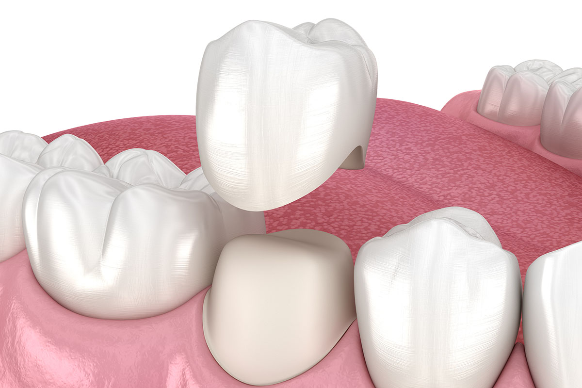 Bei abgebrochenen oder stark kariösen Zähnen, ist das Einsetzen einer Zahnkrone eine der am häufigsten durchgeführten Behandlungen. Dabei bei wird der obere Teil des Zahnes, also die natürliche Zahnkrone, zylinderförmig beschliffen, dann ein Abdruck gemacht und im Zahnlabor die gesamte Zahnkrone aus Keramik oder Metall-Keramik hergestellt.